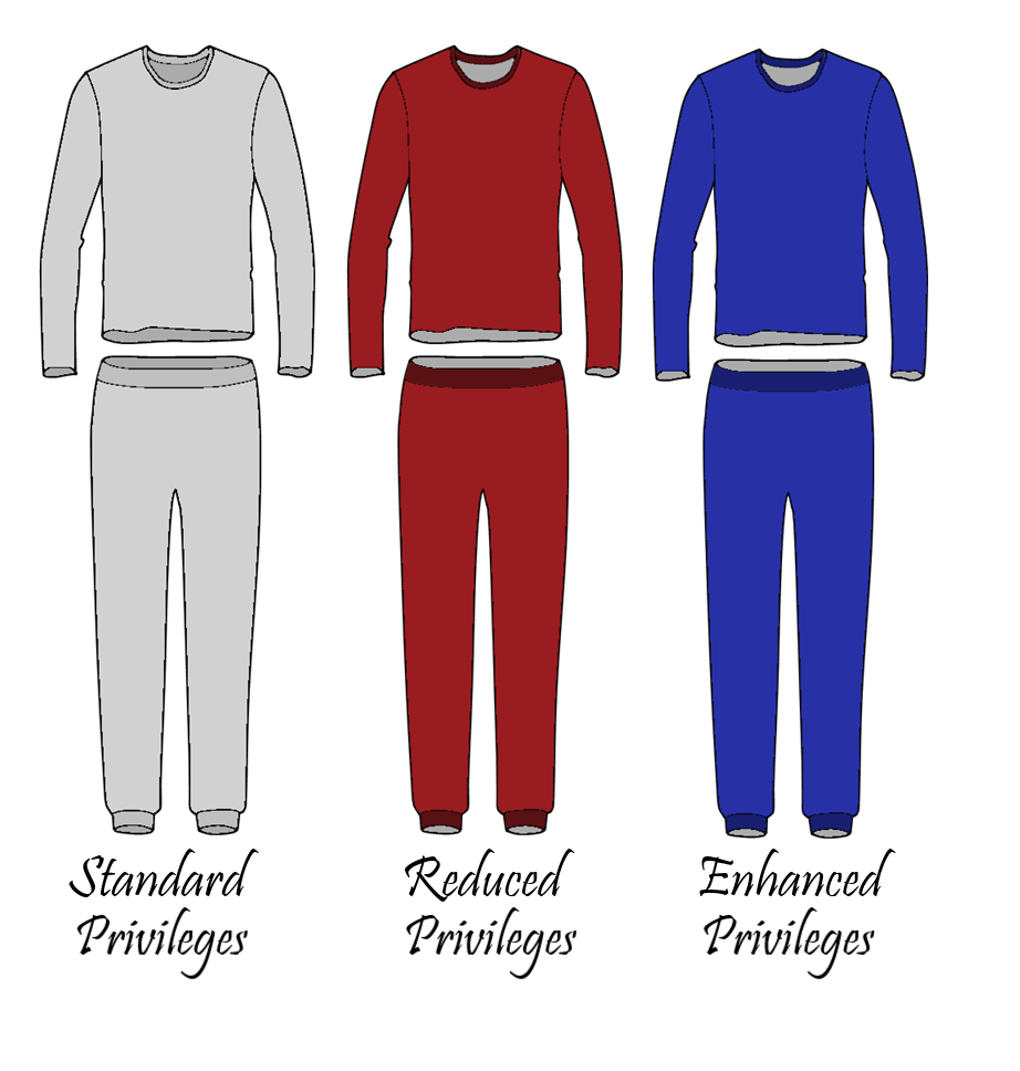 All prisoner will begin their sentence by being given a grey uniform. This entitles then to standard privileges.